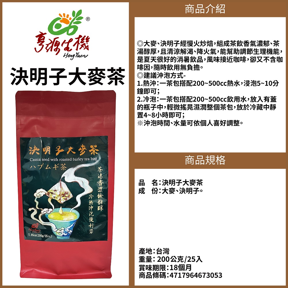 ◎大麥、決明子經慢火炒焙,組成茶飲香氣濃郁、茶湯醇厚,且清涼解渴、降火氣,能幫助調節生理機能,是夏天很好的消暑飲品,風味接近咖啡,卻又不含咖啡因,隨時飲用無負擔。