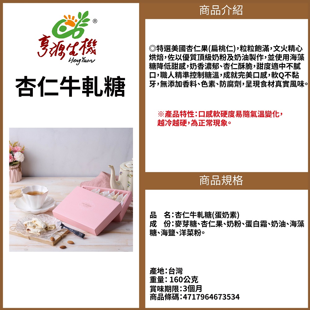 ◎特選美國杏仁果(扁桃仁),粒粒飽滿,文火精心烘焙,佐以優質頂級奶粉及奶油製作,並使用海藻糖降低甜感,奶香濃郁、杏仁酥脆,甜度適中不膩口,職人精準控制糖溫,成就完美口感,軟Q不黏牙,無添加香料、色素、防腐劑,呈現食材真實風味。