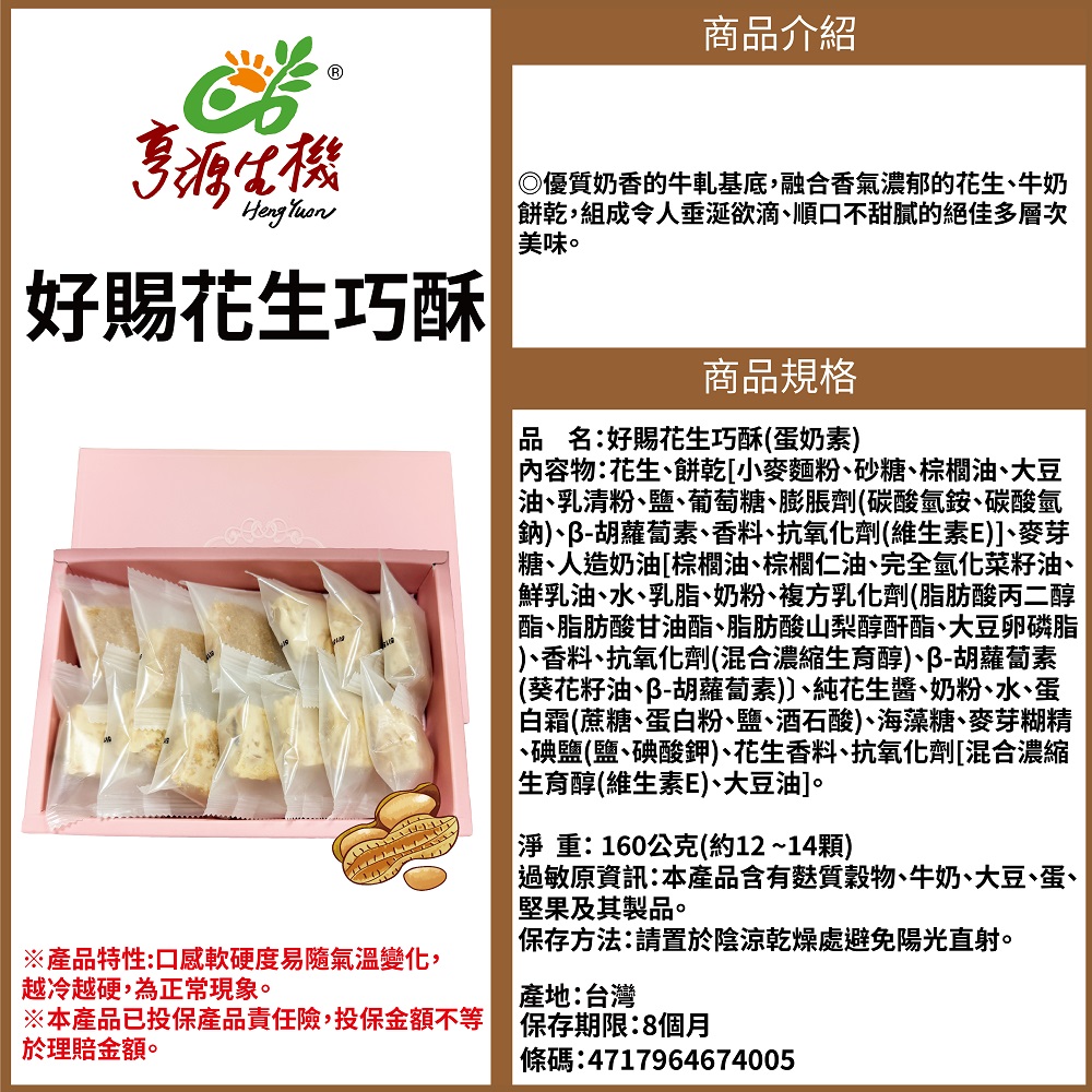花生、餅乾[小麥麵粉、砂糖、棕櫚油、大豆油、乳清粉、鹽、葡萄糖、膨脹劑(碳酸氫銨、碳酸氫鈉)、β-胡蘿蔔素、香料、抗氧化劑(維生素E)]、麥芽糖、人造奶油[棕櫚油、棕櫚仁油、完全氫化菜籽油、鮮乳油、水、乳脂、奶粉、複方乳化劑(脂肪酸丙二醇酯、脂肪酸甘油酯、脂肪酸山梨醇酐酯、大豆卵磷脂)、香料、抗氧化劑(混合濃縮生育醇)、β-胡蘿蔔素(葵花籽油、β-胡蘿蔔素)〕、純花生醬、奶粉、水、蛋白霜(蔗糖、蛋白粉、鹽、酒石酸)、海藻糖、麥芽糊精、碘鹽(鹽、碘酸鉀)、花生香料、抗氧化劑[混合濃縮生育醇(維生素E)、大豆油]。